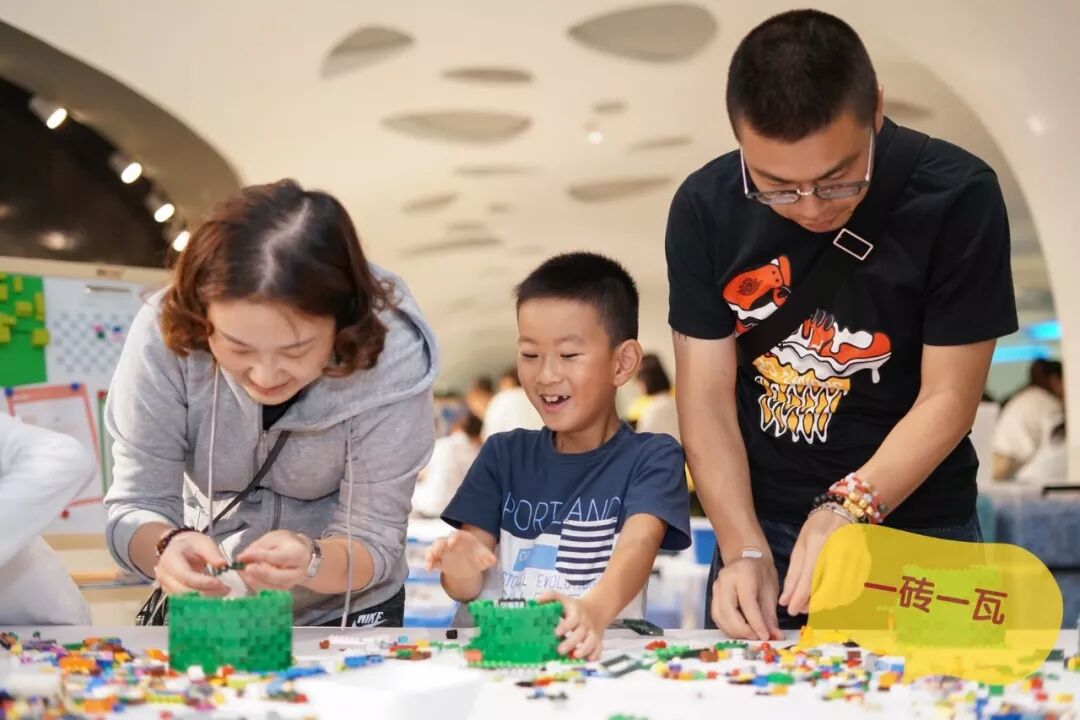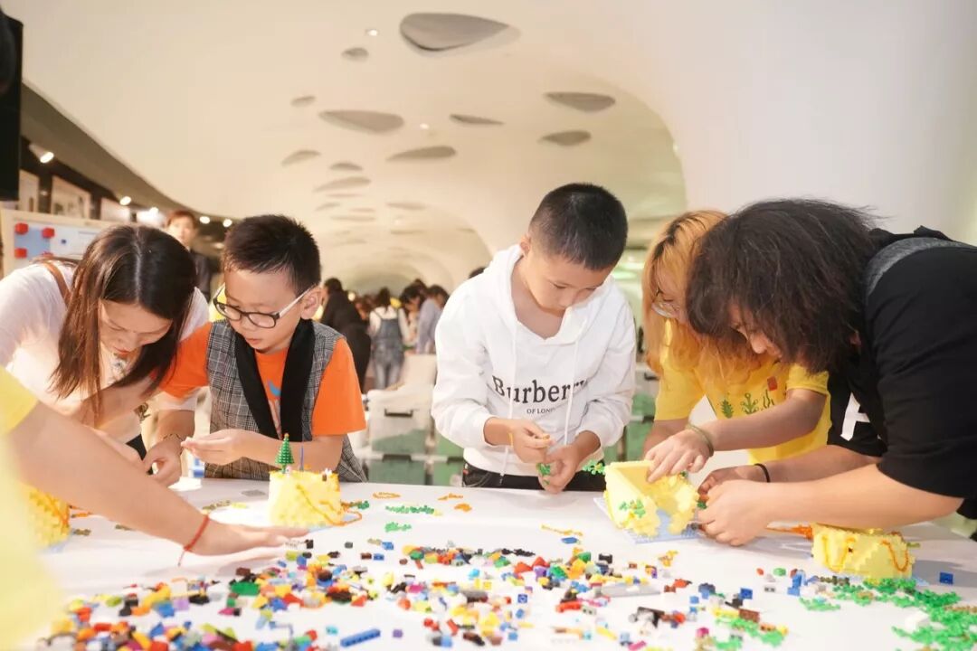 从 21 日上午 10 点开始,参与者按预约场次进入活动区域,巨量的乐高积木颗粒被拼砌成建筑模型作品。所有参与者都玩得异常投入和认真,一种强烈的使命感弥漫在现场,仿佛他们在建造真正的城市,互不相识的大小孩子们能积极相互沟通,一起研究着如何将他们各自的积木“建筑体” 拼合在一起。